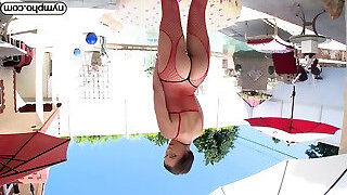 Redhead MILF Red XXX masturbating outside by the pool